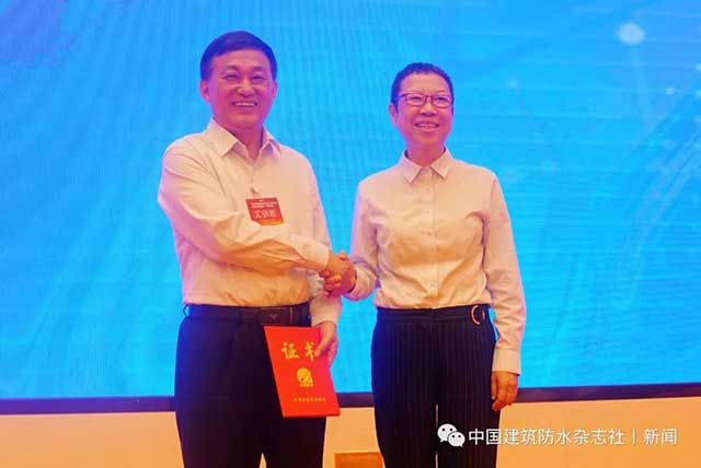 中國建筑防水協(xié)會常務(wù)駐會副會長苗燕向胡希寶頒發(fā)瓦屋面分會副秘書長證書。