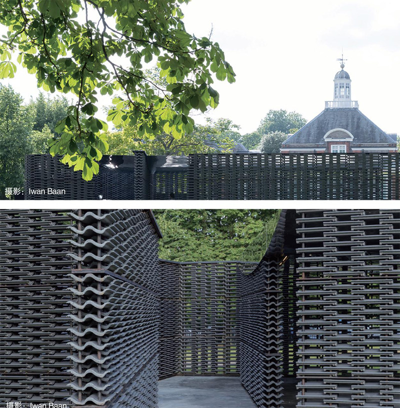 我們都知道,水泥瓦一般用作普通民房或者高檔別墅的屋頂建設(shè),但是設(shè)計(jì)師弗里達(dá)、埃斯科韋多設(shè)計(jì)的蛇形展亭,以水泥瓦建造,這種水泥瓦一般用于建造屋頂,顏色偏深而且具有獨(dú)特的質(zhì)感。展亭將水泥瓦以左右錯(cuò)位、類似植物的排列方式堆疊,形成帶有墨西哥特色的鏤空墻幕。展亭的庭院中還設(shè)一個(gè)三角形的水池,屋頂?shù)紫聞t以鏡面鋪就,在日光照射下將呈現(xiàn)不同的視覺效果。展亭的中軸線從南延伸至北,與數(shù)英里以外的格林威治子午線的方向契合,以此強(qiáng)調(diào)展亭同時(shí)也是“時(shí)間儀”的這一特質(zhì)。